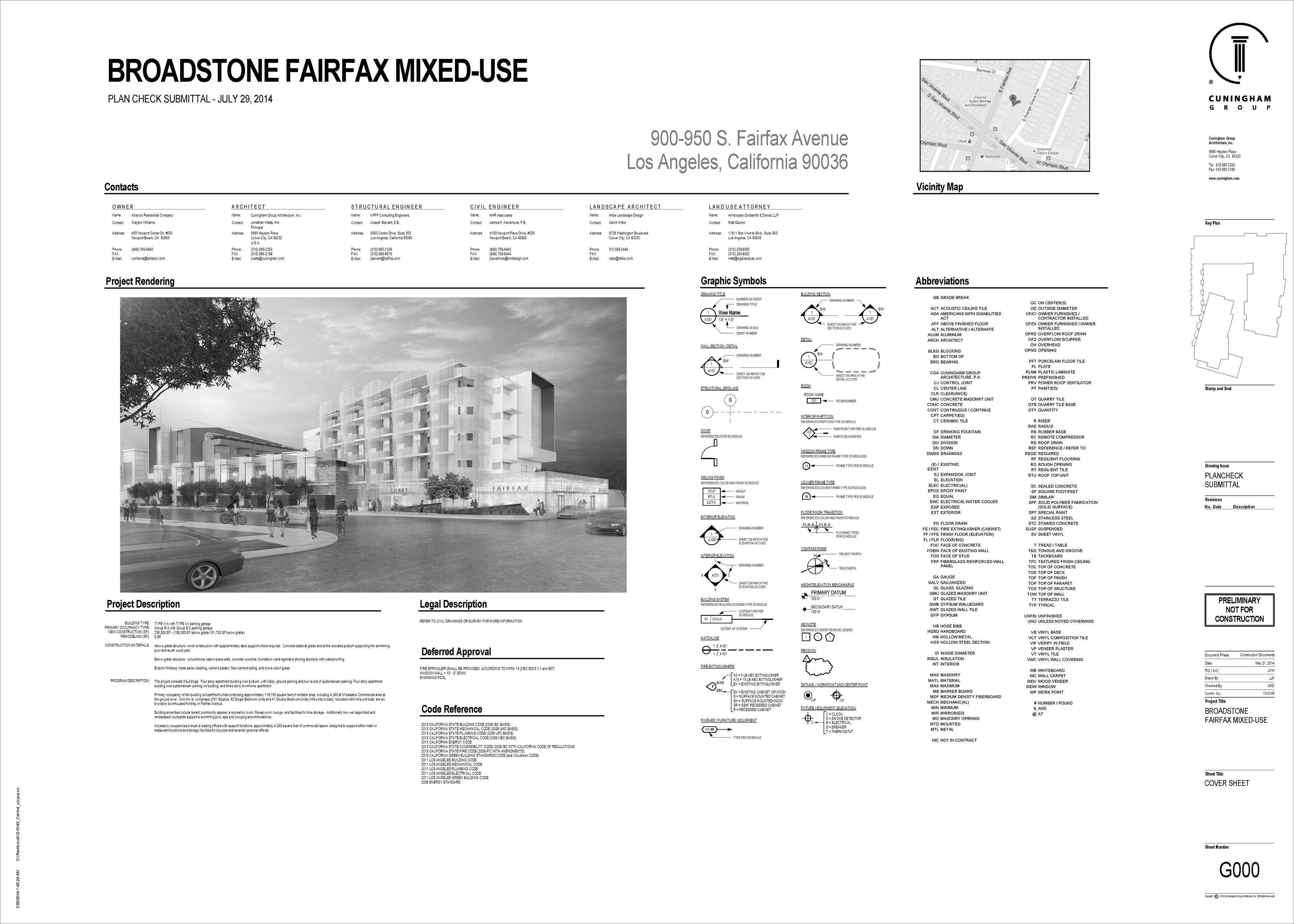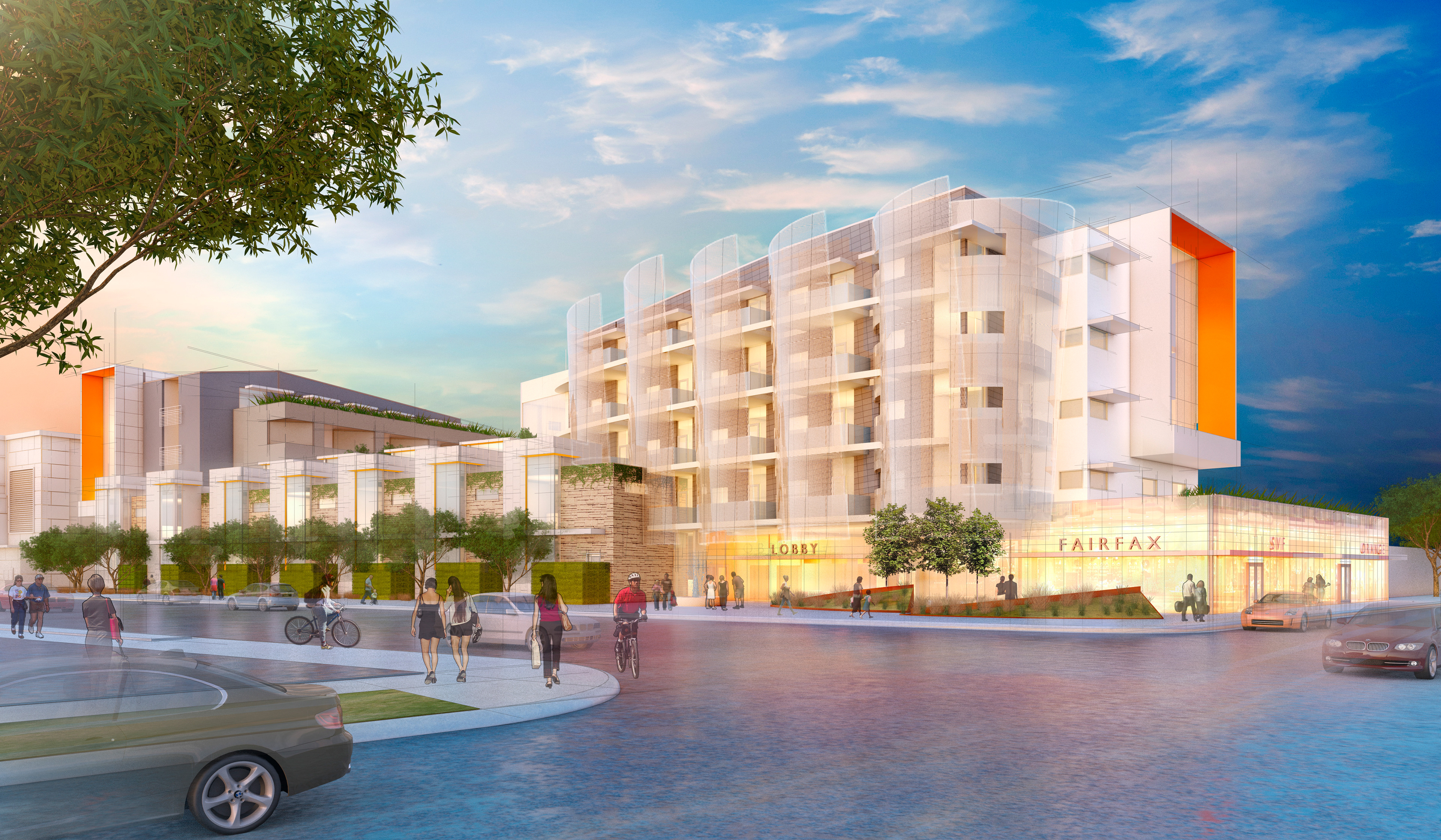 Cuningham Group Architecture A 5 story mixed-use development in Los Angeles, CA. Sitting on a high volume intersection of San Vicente and Fairfax, the project is comprised of ground floor retail, 8 town homes, and 142 apartments.