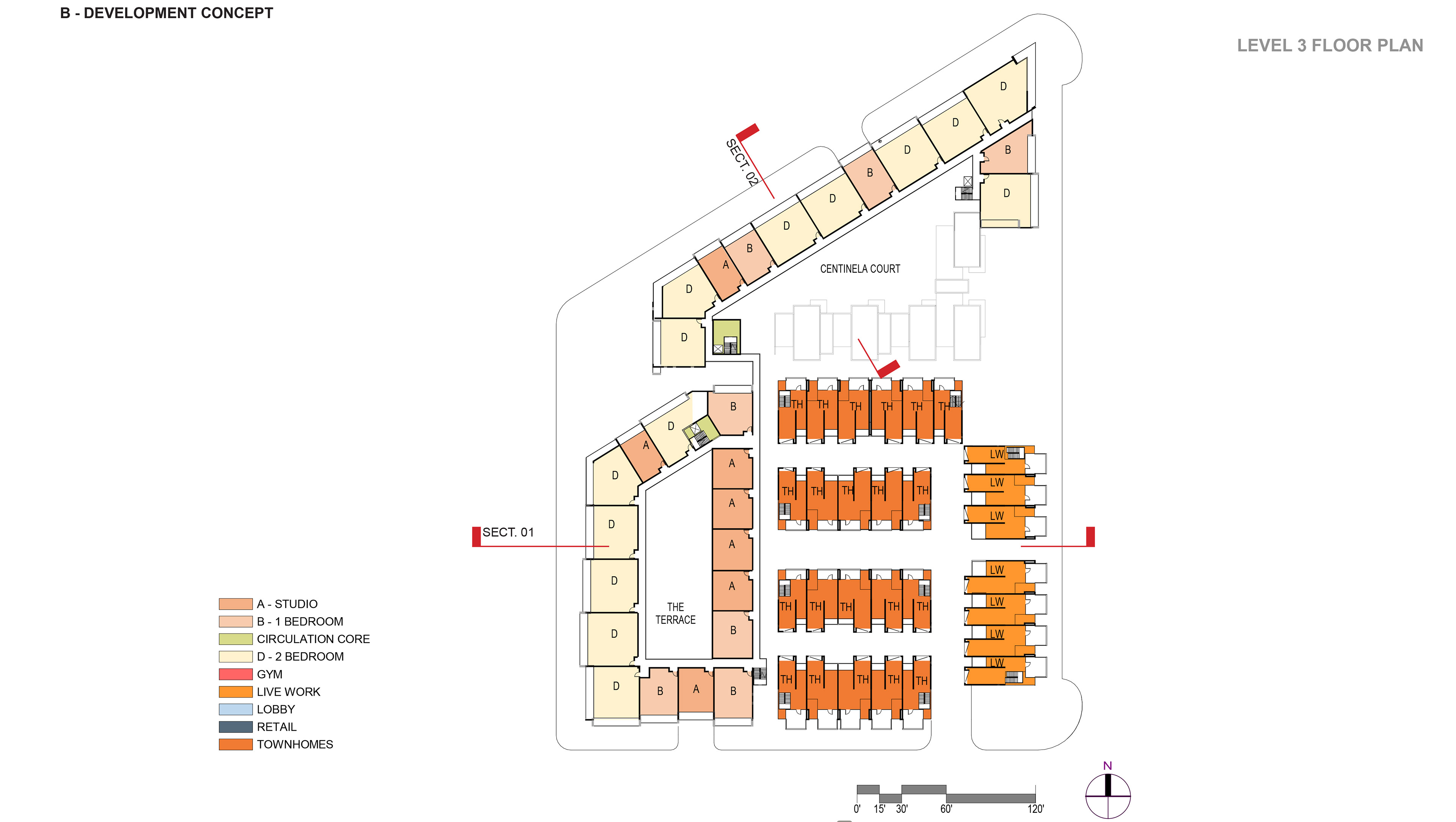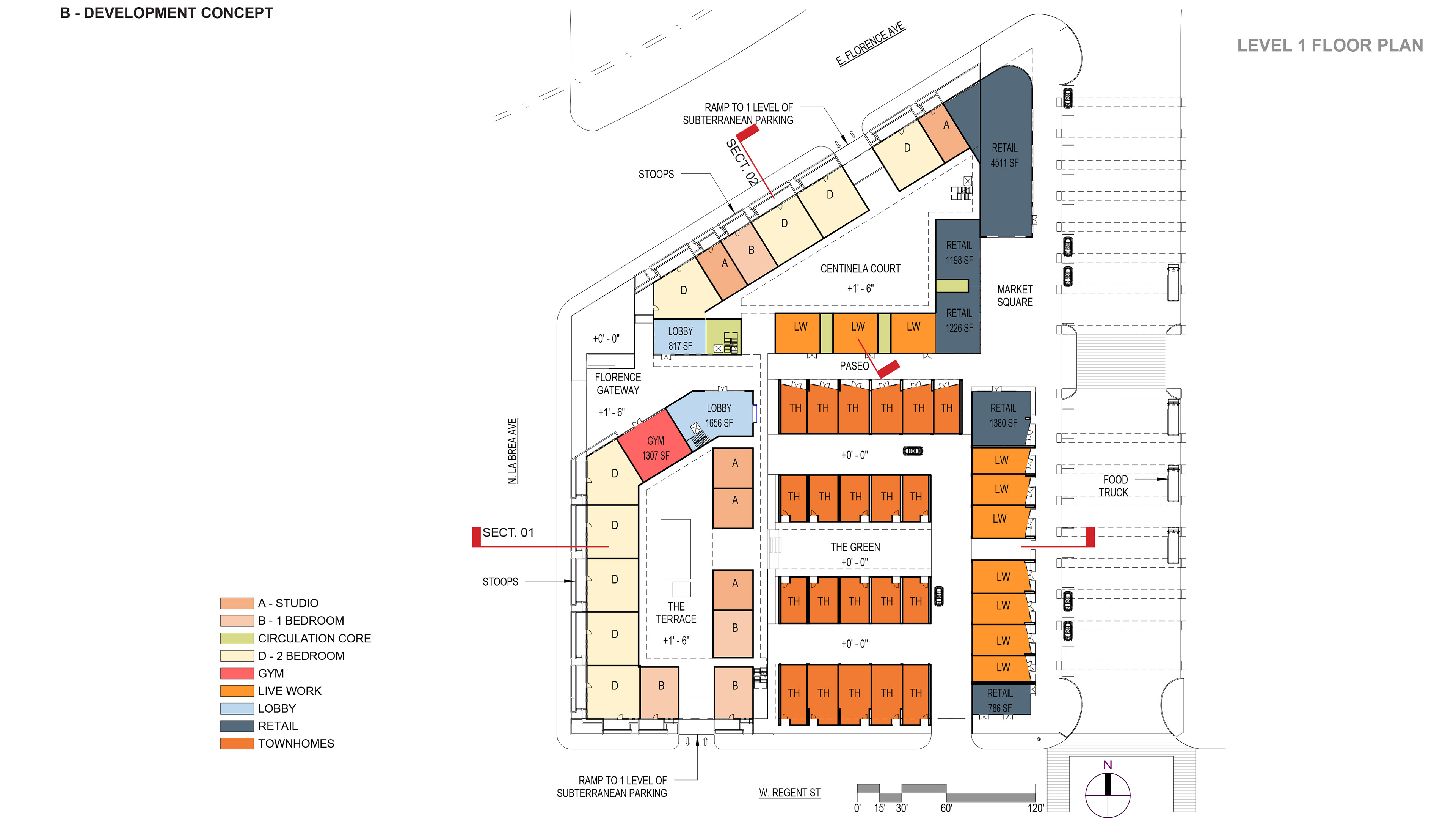 Cuningham Group Architecture worked with a developer to win a Transit Oriented Development project. A 4 story condo building wraps around the busier La Brea and Florence avenues. The box masses help create rhythm and motion that will be experience by the train passengers. A series of 3 story Live/Work units, an outdoor public square and a variety of retail spaces front Market Street. The architectural expression of the Lice/Work units recall the modernity of Rudolph Schindler. White plaster volumes and planes with large expanses of glass and wood siding help activate the streetscape.