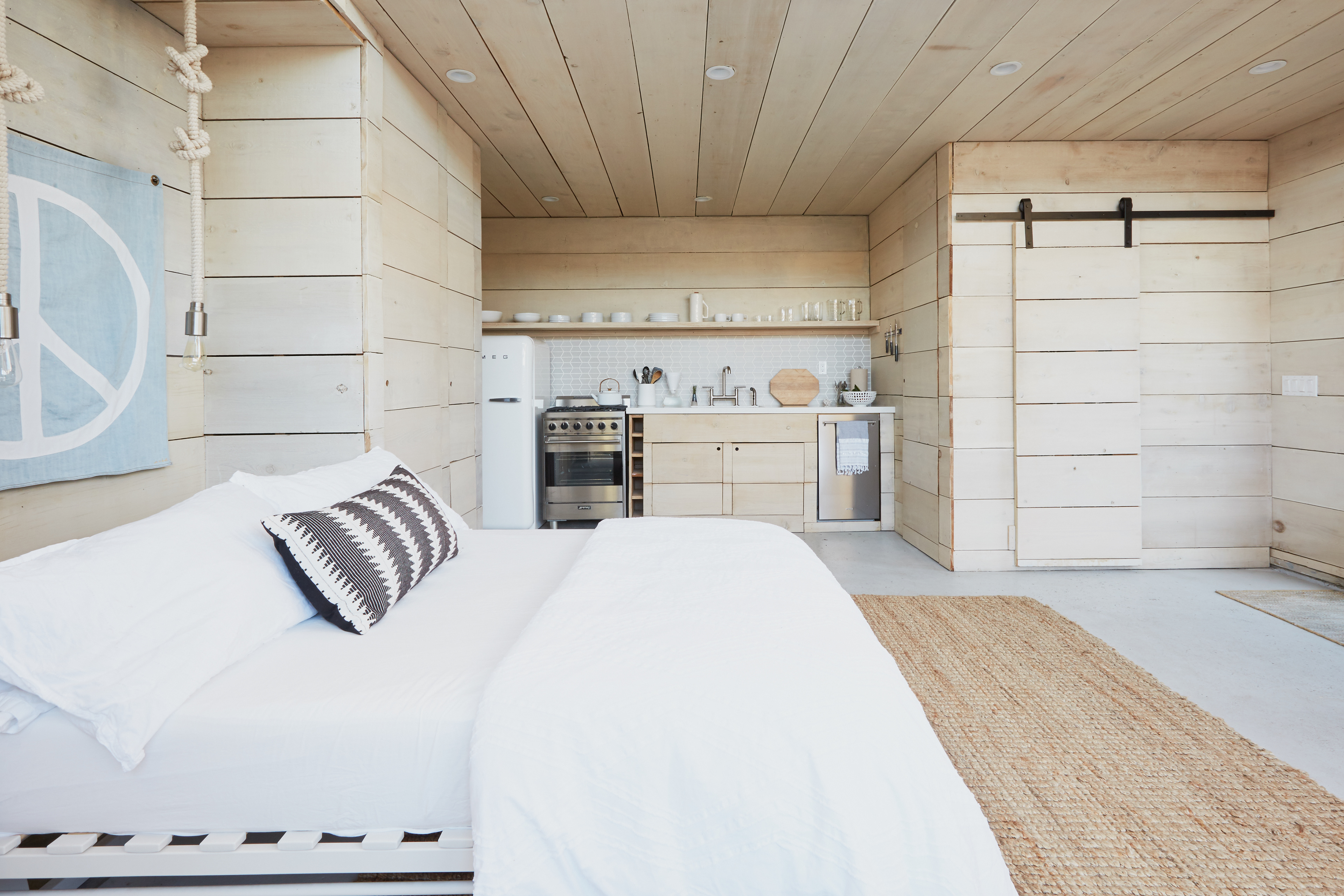 Located in Venice Beach, California, this garage renovation is a back yard haven for working, relaxing, visiting, and soaking up the beautiful Southern California climate. A re-pitched roof allowed for a mezzanine that leads to a roof deck garden. The roof deck sits atop additional storage and a hot tub deck on the ground level. The open living space opens to a front porch and garden that leads to Zanja St. The living space remains open by having all the storage and murphy bed enclosed in a built-in that encompasses the whole east wall. The kitchen is open to the living space and looks out to the front garden. The bathroom is a 5’x5’ wet bathroom that is water tight and has the shower head coming down in the middle of the room. The hot tub deck has additional storage below the deck and all covers blend in seamlessly with the deck. This studio loft is an outlet for the main house and a fun addition to the back yard.